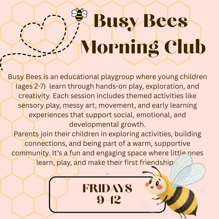 We’ll be exploring: ⛄ Snowmen & snowflake art ❄️ Ice painting & winter sensory trays 🧤 Seasonal clothing play & cozy animals 🌨️ Fake snow for scooping, pouring, and squishing 🎨 Process art and sensory exploration Busy Bees is all about slowing down, playing together, and connecting with your child through simple, meaningful activities. Come ready to play, explore, and make winter memories together — we can’t wait to see you! Join us on Fridays to play, learn and grow.! Time: 9:00-12:00 9:00………………………………….Welcome, come and explore 10:00……………………………… Special Activity 10:30………………………………..Time to explore and play 11:00……………………………......Snack and a story 12:00……………………………......Time to pick up and say goodbye!